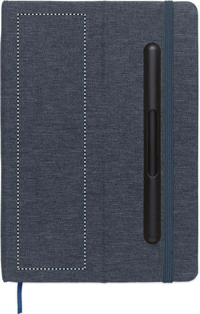 A5 anteckningsbok med hårt RPET-omslag med telefonhållarfunktion. Integrerad 2-i-1 bläckfri penna i ABS. Inbunden, 192 linjerade sidor av återvunnet papper (96 ark). Matchande band och bokmärke.