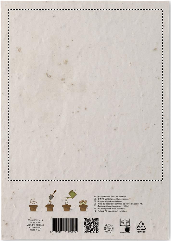Återvunnet pappersark för vildblomsfrön i A5-format (80 gr/m²). Tillverkad i EU.