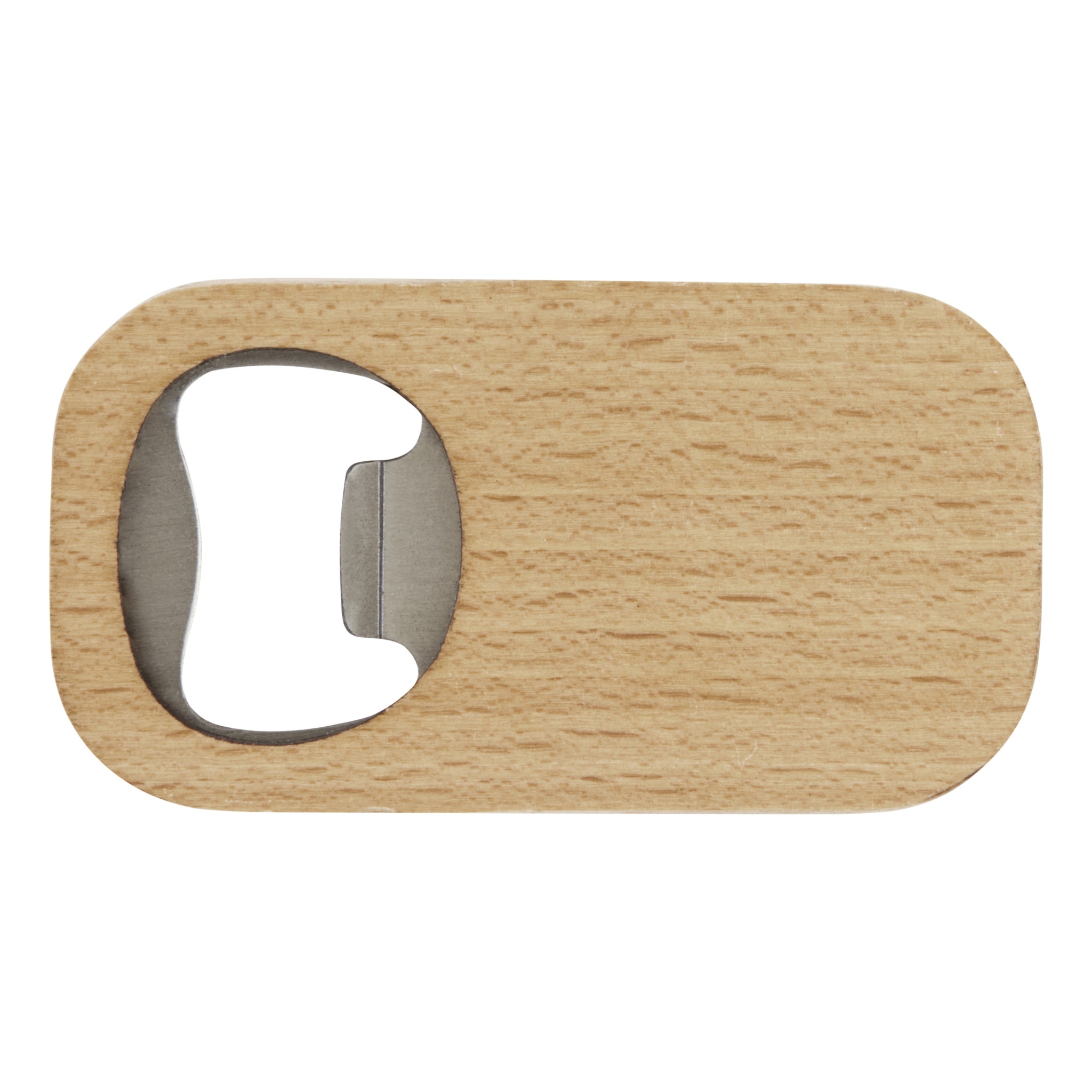 Flasköppnare i rostfritt stål med träyta.