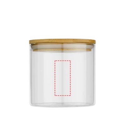 Liten matbehållare tillverkad av glas med bambulock. Den kombinerar fördelarna med glas som är ett säkert och hållbart material med de förnybara egenskaperna hos bambu. Glasbehållaren (utan lock) är mikrovågsugn- och maskindisksäker. Förpackad i en låda av återvunnet kraftpapper. Kapacitet: 320 ml.