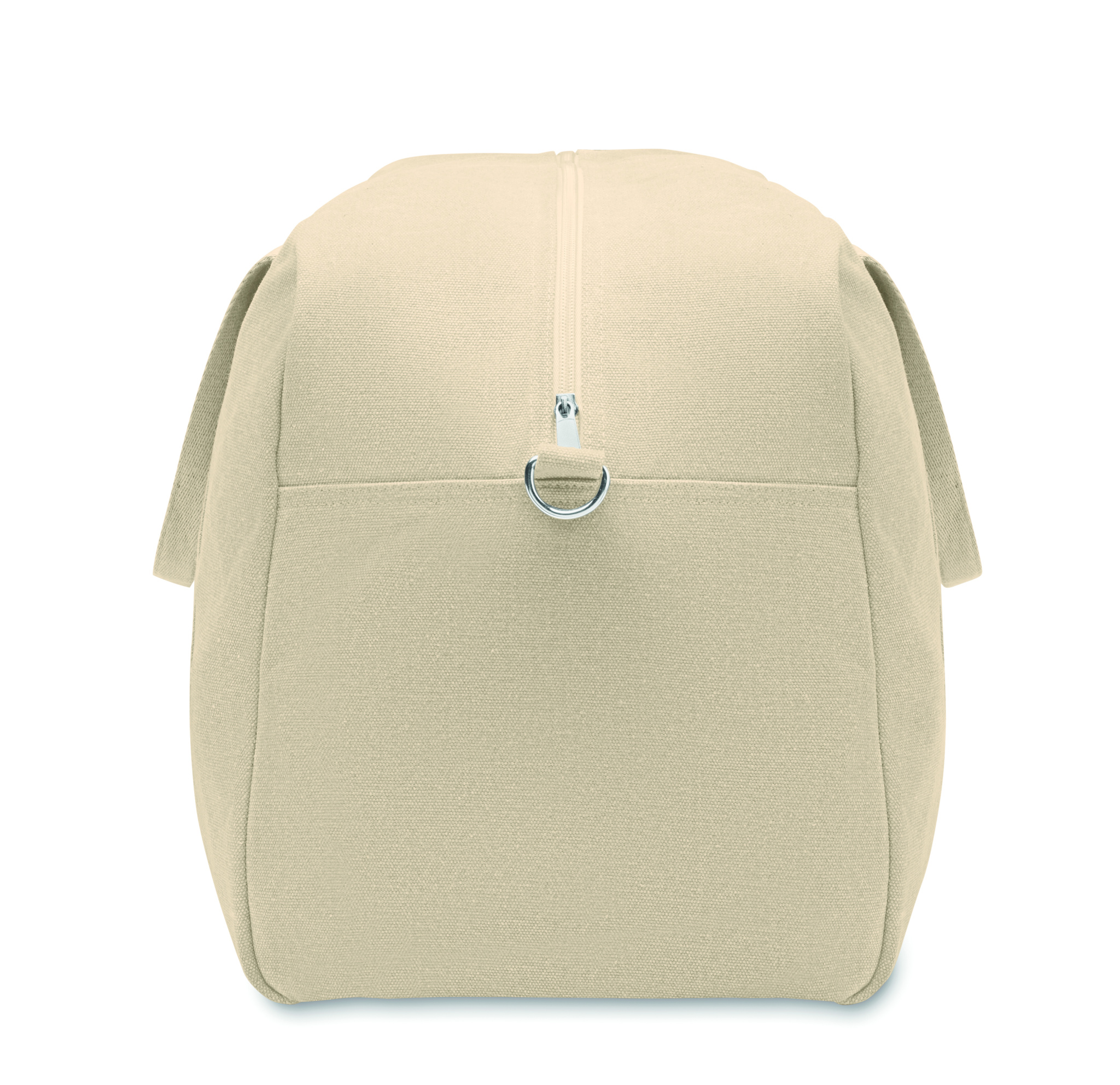 Duffelbag/väska i återvunnet 450 gr/m² tyg (60% återvunnen bomull och 40% återvunnen polyester) med justerbar och avtagbar bomullsrem.