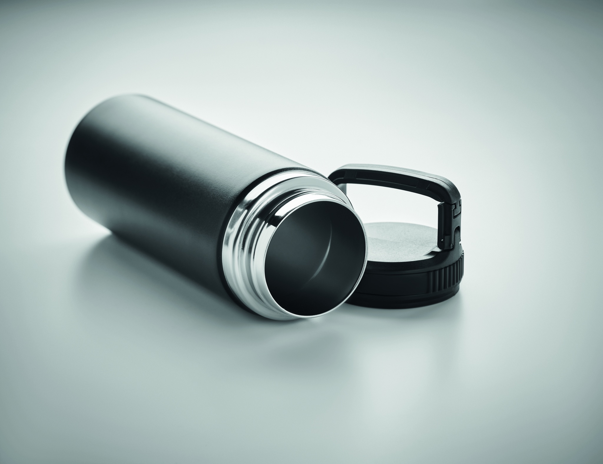 Termoflaska i rostfritt stål med dubbelvägg och krokhängare på locket. Kapacitet: 500 ml för varma eller kalla drycker.