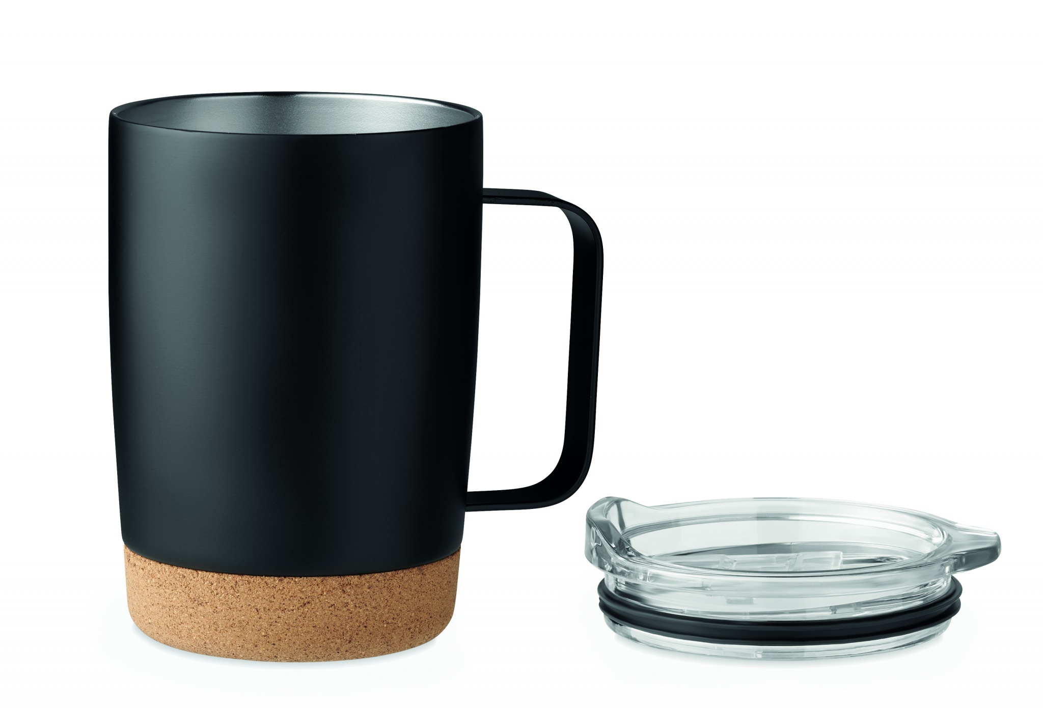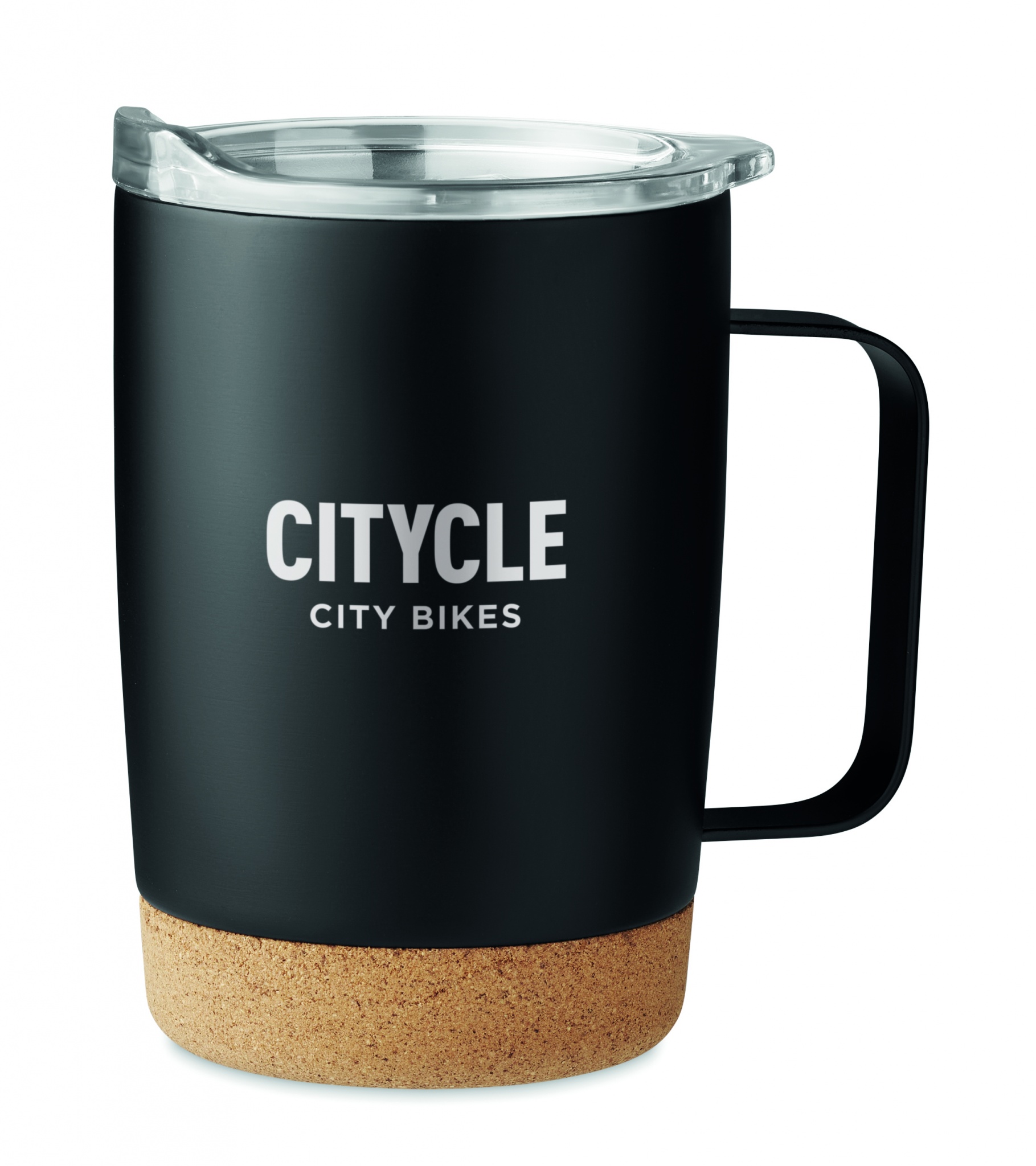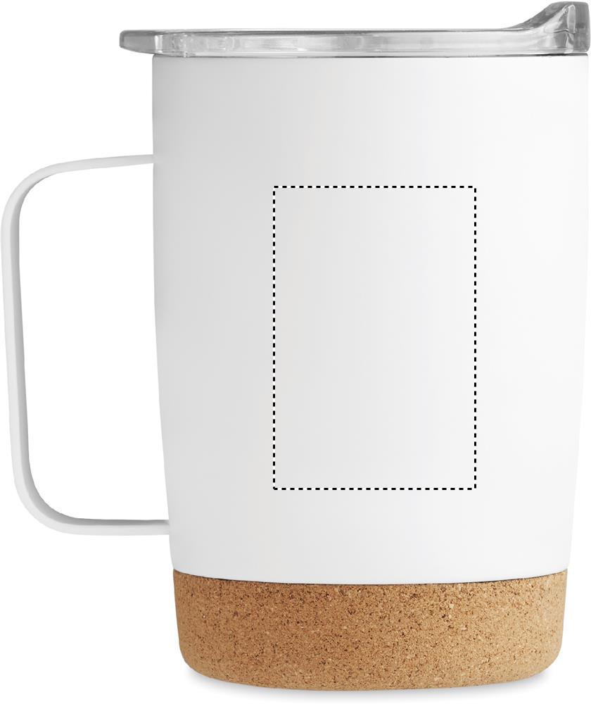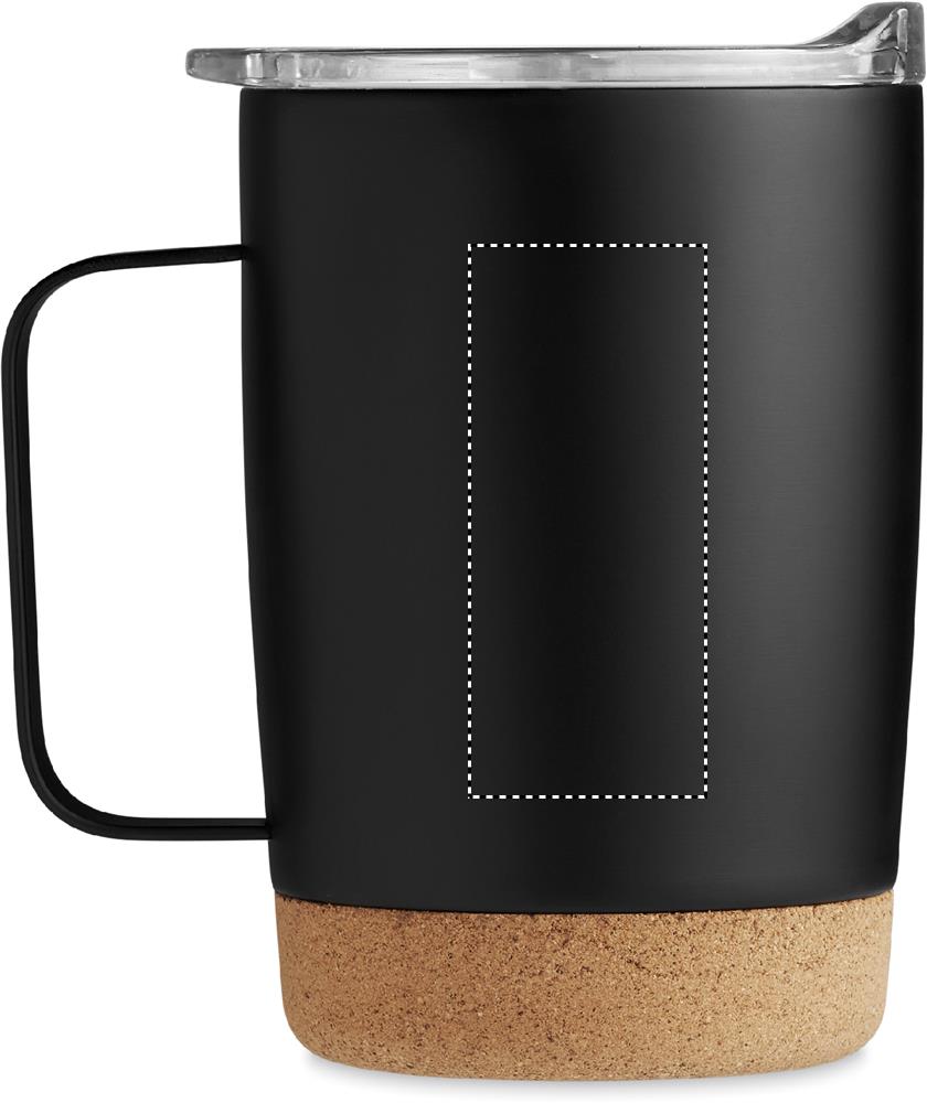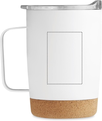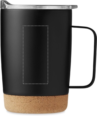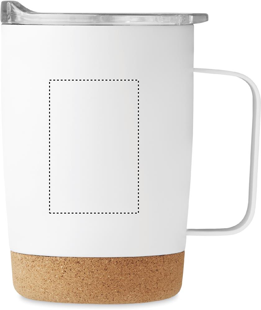 Termomugg i rostfritt stål med korkbotten och skjutbart lock för drickhål. Volym: 300 ml.