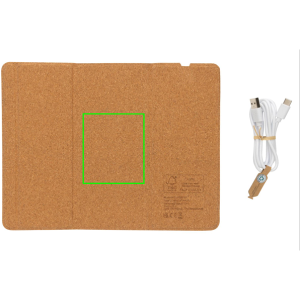 Musmatta med utsida i FSC® 100% kork, 10W trådlös laddning. Kan användas både som musmatta och mobilställ. Trådlös laddning är kompatibel med alla QI-aktiverade enheter som senaste generationen Android, iPhone 8 och upp. 120cm type C laddningskabel i RCS certifierad återvunnen TPE medföljer. Levereras i FSC® mix kraft förpackning. Type-C in; 9V/2A; trådlös output 9V/1.1A (10W)