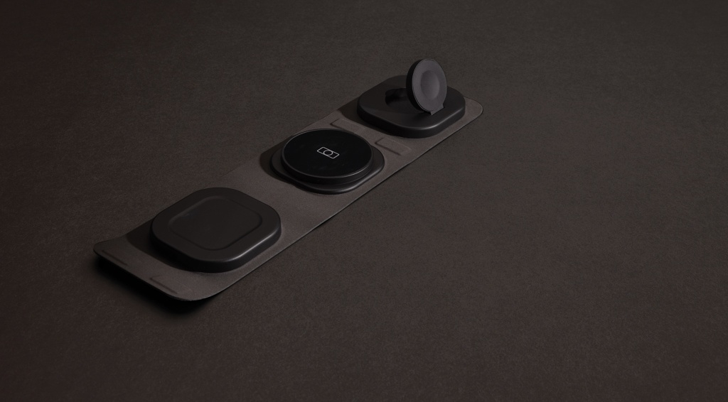 Lyxig och hopfällbar trådlös 3 i 1-laddare tillverkad av RCS återvunnet ABS. Totalt återvunnet innehåll: 46% baserat på total produktvikt. RCS-certifiering garanterar en fullständigt certifierad leveranskedja för de återvunna materialen. Den trådlösa laddaren är utrustad med en magnetisk 15W trådlös laddare och en extra 5W trådlös laddare lämplig för fodral till hörlurar eller andra små trådlösa laddningsbara enheter och en 2,5W trådlös laddare för smartklockor (endast Apple-klockor) 120cm kabel i RCS-certifierad återvunnen TPE medföljer. Levereras i FSC® mix kraftförpackning. Produkten och tillbehören är 100% fria från PVC. Input: 9V/3A för optimal användning. Output: Telefon: 9V/1.1A; 9V/1.67 A/(15W), hörlurar: 9V/1.1A; 9V/1.67 A/(15W), hörlurar: 9V/1.67 A/(15W): 5V/1A (5W), klocka: 5V/1A (5W): (5V/0,5A).