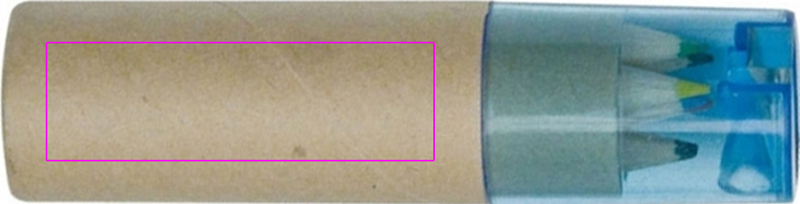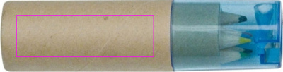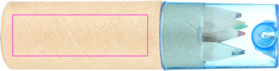 Kartong med sex korta, tjocka färgpennor och integrerad vässare med blått transparent plastlock. Vi trycker din logotyp på kartongen.