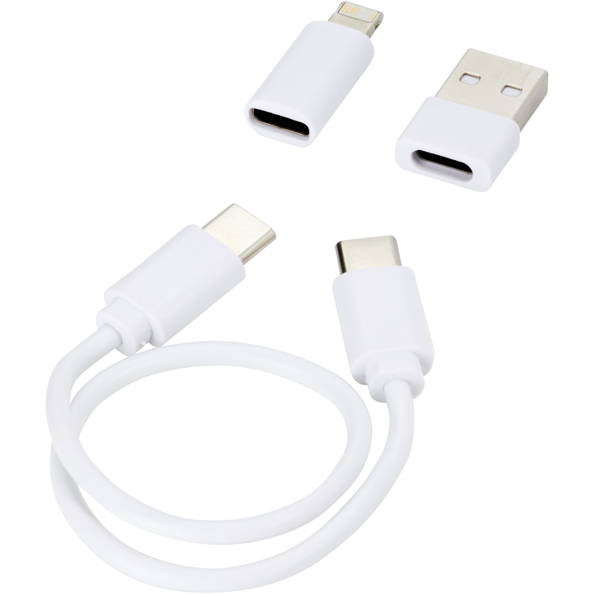 Modulär dataöverförings- och laddningskabel tillverkad av återvunnen plast, levereras i en elegant förvaringsbox. Kabeln erbjuder flera olika laddningslösningar: Typ-C- och USB-A-ingång samt USB-utgångarna typ-C/iOS/mikro. Tack vare alla dessa adaptrar och kontakter kan du med denna kabel ladda de flesta smarttelefoner, kameror, powerbanks, öronsnäckor osv. Kabeln har en högsta uteffekt på 2 A. Har ett utmatningsstift som är praktiskt när du behöver ta ut SIM-kortet ur telefonen. Förvaringslådan har också plats för ett mikro SD-minneskort och ett nano-SIM-kort, vilket gör den till det perfekta resetillbehöret. Kabellängd: 28 cm. Levereras i ett kuvert av 100 % återvunnet kraftpapper.
